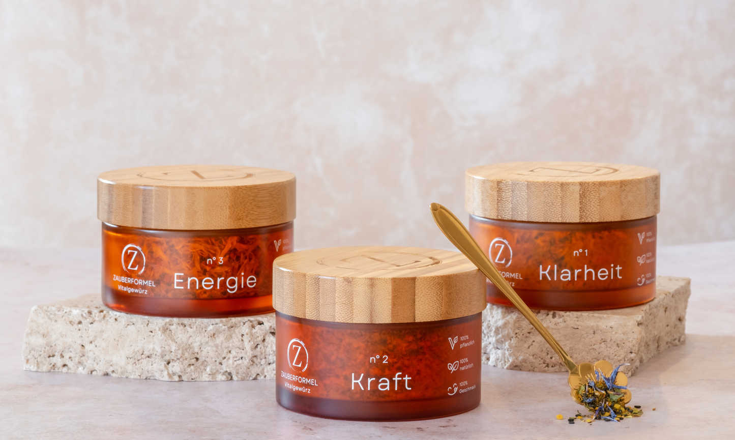 Unsere handgemachten Vitalgewürze KLARHEIT, KRAFT und ENERGIE im beliebten 3er-Set im Glas und als Nachfüllpacks. Damit du deine edlen Gläser hinterher wieder befüllen kannst.